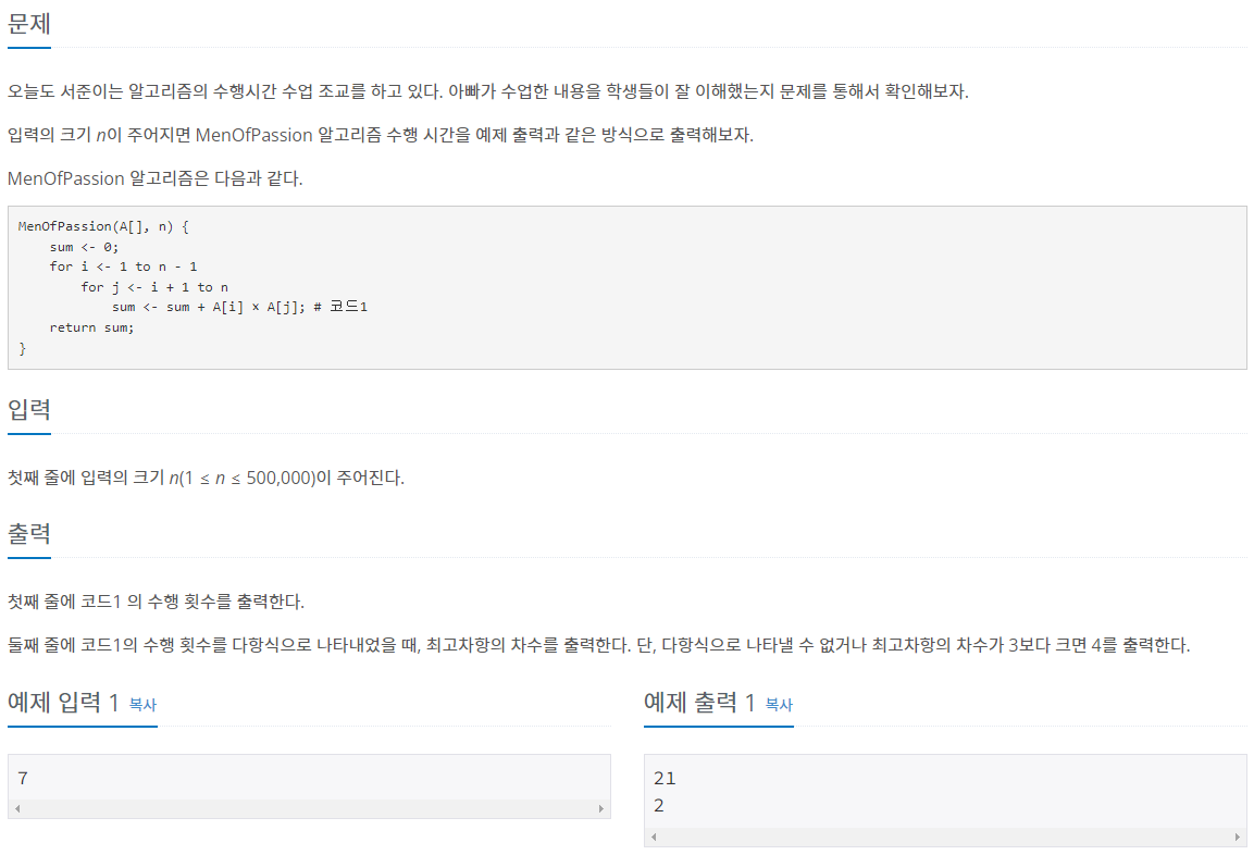 오늘도 서준이는 알고리즘의 수행시간 수업 조교를 하고 있다. 아빠가 수업한 내용을 학생들이 잘 이해했는지 문제를 통해서 확인해보자. 입력의 크기 n이 주어지면 MenOfPassion 알고리즘 수행 시