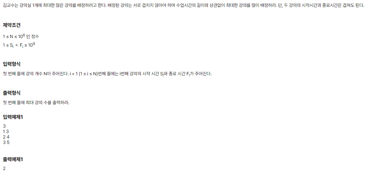 김교수는 강의실 1개에 최대한 많은 강의를 배정하려고 한다. 배정된 강의는 서로 겹치지 않아야 하며 수업시간의 길이와 상관없이 최대한 강의를 많이 배정하라. 단, 두 강의의 시작시간과 종